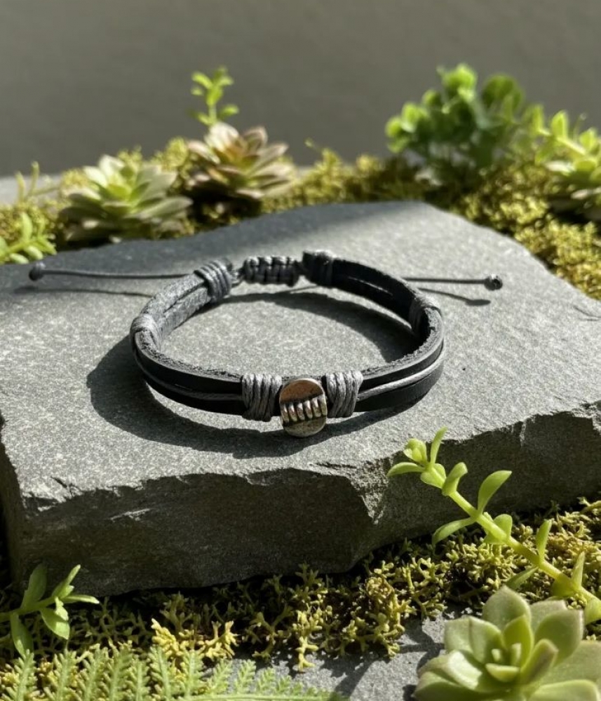 Стилна мъжка гривна от естествена кожа с плетка тип Шамбала и регулируемо закопчаване, което позволява лесно нагласяне спрямо всяка китка. Благодарение на характерния плъзгащ механизъм, размерът се адаптира бързо и удобно – без притискане и без разхлабване.
