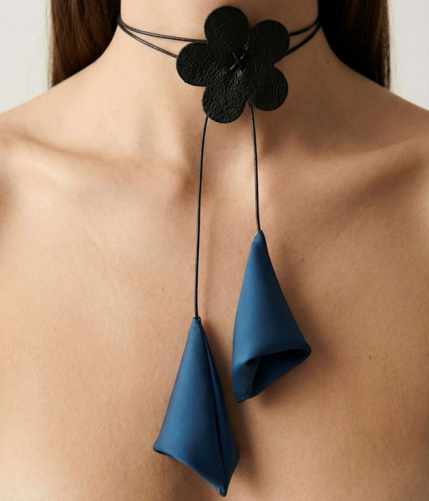 - Елегантен чокър от естествена кожа, допълнен с нежно цвете, което не само придава стилен акцент, но и позволява регулирането на дължината за перфектно прилягане към врата.