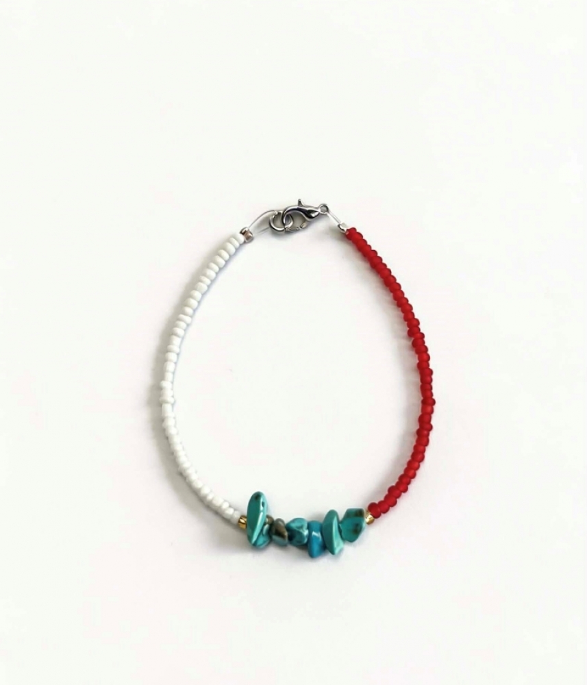 - Нежна мартеница с естествен тюркоазен чипс – символ на защита, късмет и вътрешна хармония. Фините неправилни форми на тюркоаза придават автентичен и естествен облик, а съчетанието с традиционните бяло и червено носи духа на Баба Марта с модерен акцент.